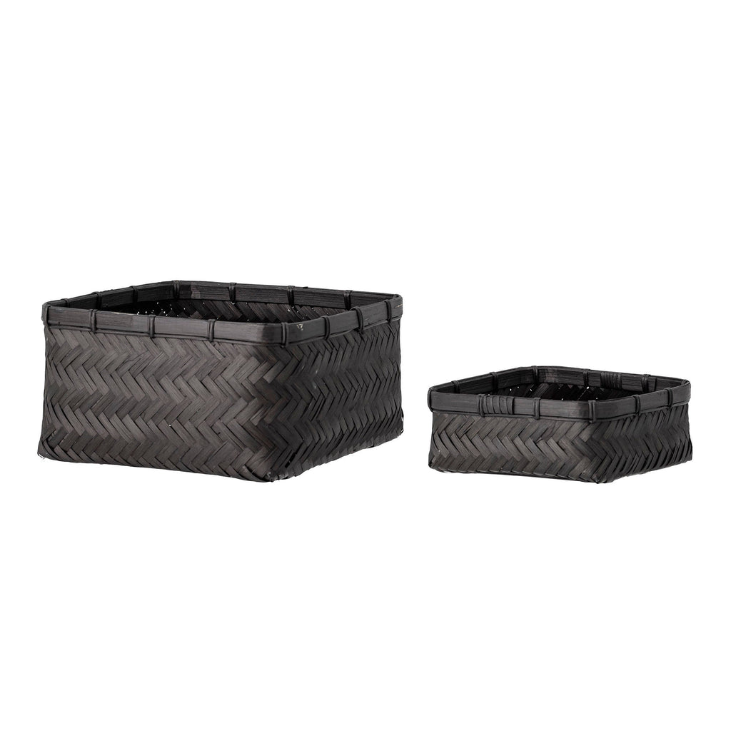 Two black baskets made of coloured bamboo that can be used for a vast variety of purposes. Use them in the entrance hold keys, spare coins and other bits and pieces. Use them in the bathroom to hold toiletries or toilet rolls. Or maybe on top of a dresser or inside a cabinet where you need a helping hand to organise your things. The baskets come in a set of two.