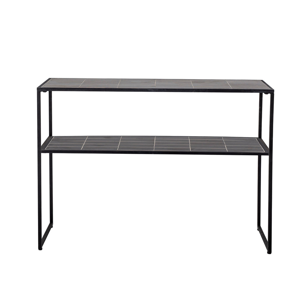 Der June Konsolentisch ist ein prächtiges Möbelstück. Die Konsole ist aus Stein und Metall in schwarzen Farben gefertigt, wobei die geraden Linien eine skandinavische und zeitlose Note verleihen. Sie hat Keramikmosaik auf den oberen und unteren Regalen, und jedes kann ein maximales Gewicht von zwanzig Kilo tragen.