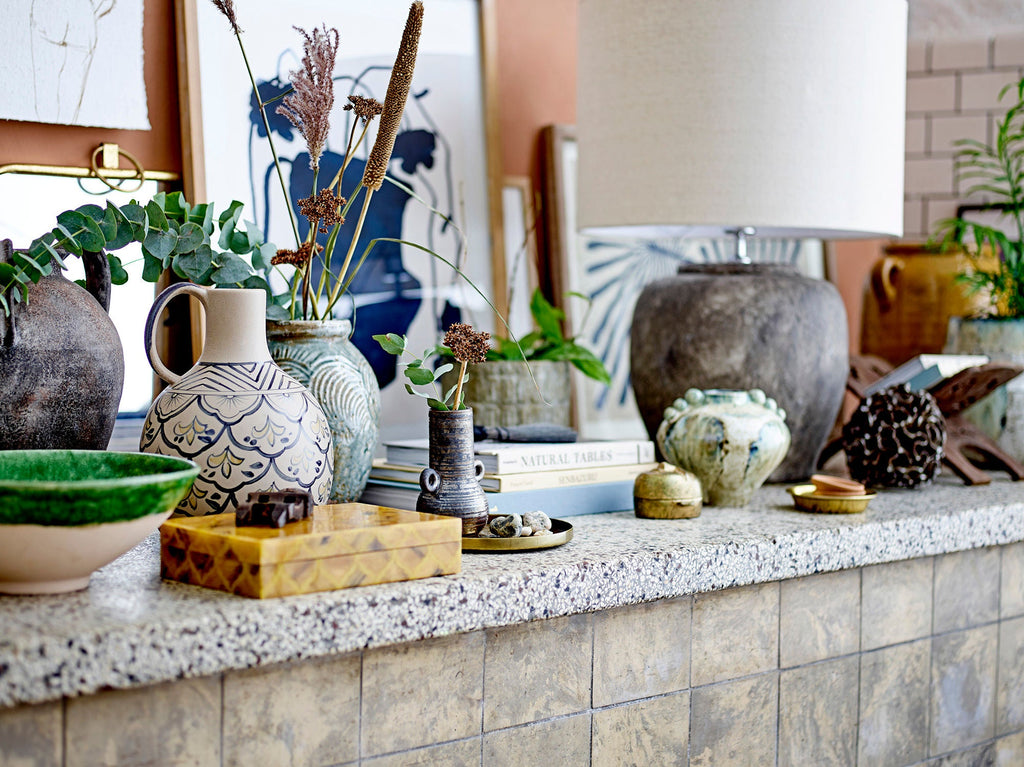 The Damian Vase by Bloomingville made of terracotta is a rustic vase. The vase has a beautiful green reactive glaze and an abstract pattern engraved. Due to the nature of the glaze and item being handcrafted, color variations may occur. Perfect for dried flowers, as it is not 100% waterproof.
