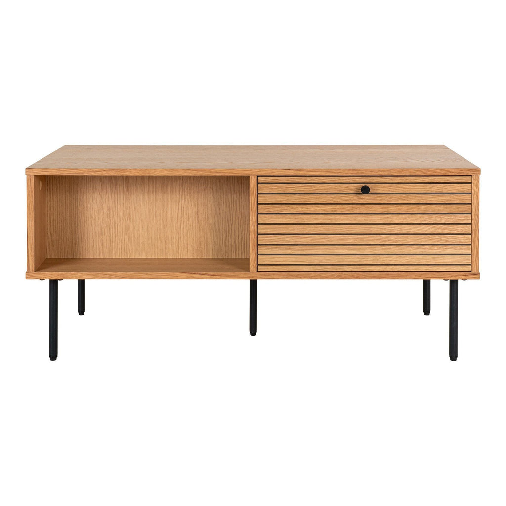 Couchtisch, 2 Schubladen, Eichenfurnier, natur, schwarze Metallbeine 50x100x45 cm