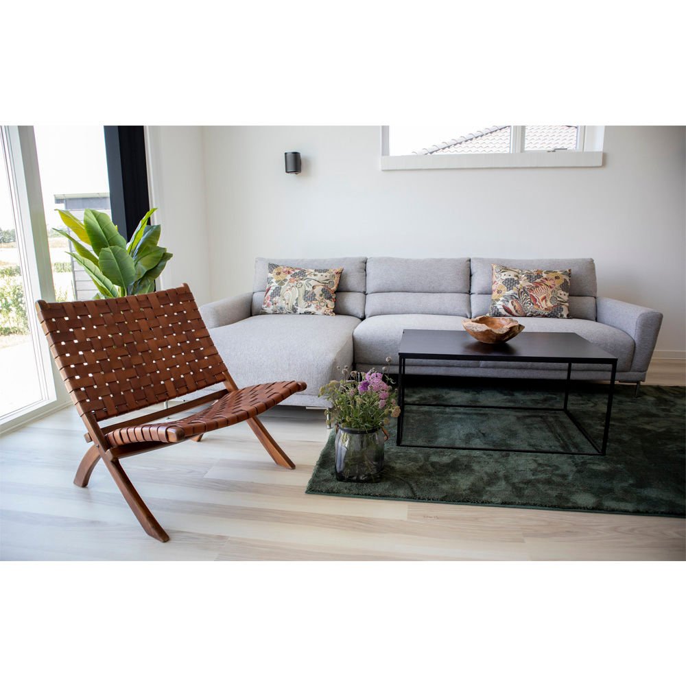 Eleganter Klappstuhl aus edlem Teakholz und braunem Leder – perfekt für stilvolle, flexible Sitzlösungen.