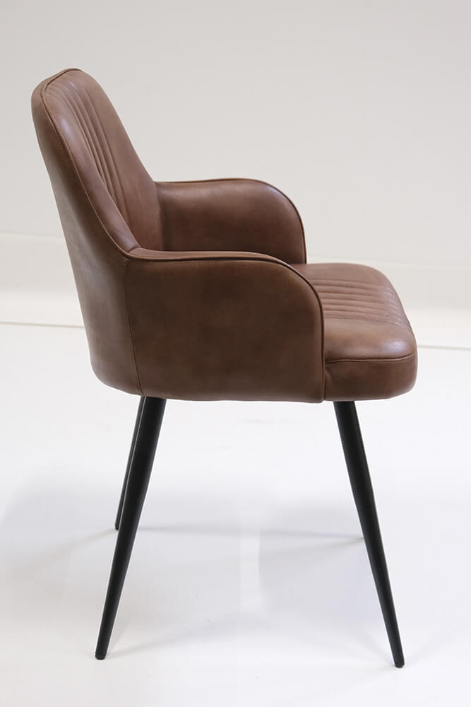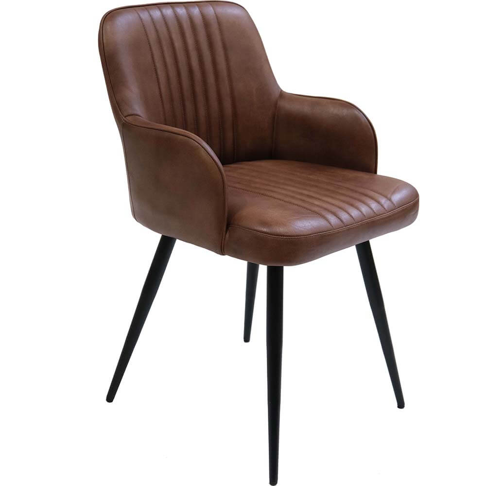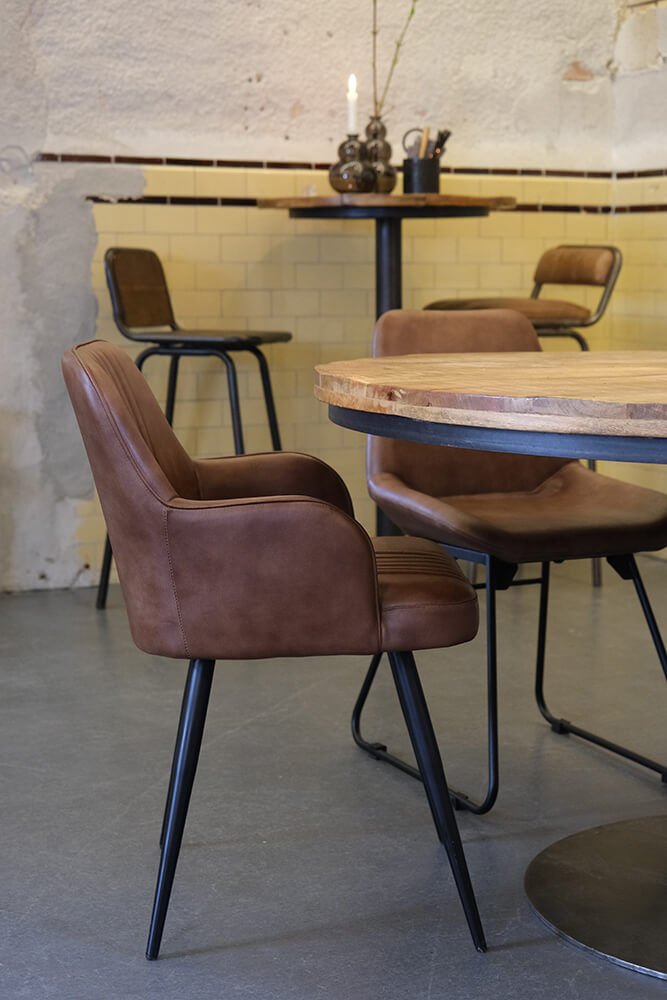 Dieser Esszimmerstuhl aus braunem Büffelleder ist die perfekte Wahl für alle, die eine rustikale und einladende Sitzgelegenheit suchen. Die Polsterung aus authentischem Büffelleder verleiht dem Stuhl einen rustikalen und natürlichen Charme, der ideal in eine maskuline und entspannte Einrichtung passt. Die schlichten schwarzen Metallbeine setzen einen modernen Akzent, während die dekorativen Nähte an Rückenlehne und Sitzfläche einen rauen und detailreichen Look schaffen. Mit seinen Armlehnen und dem komfortablen Design ist der Esszimmerstuhl ideal für den Einsatz in Cafés, Restaurants oder Zuhause im Esszimmer geeignet.